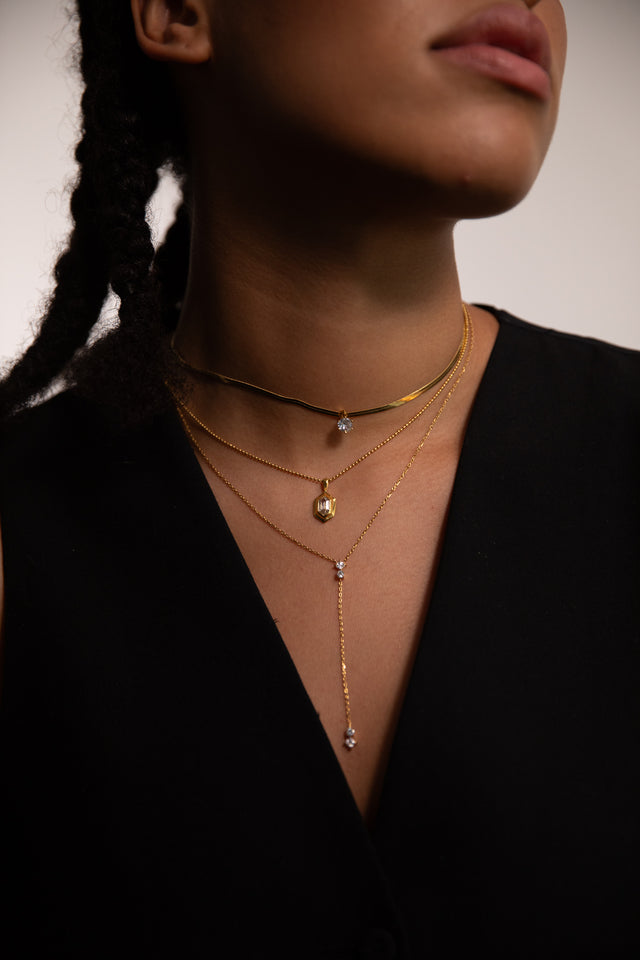 Ein Choker allein ist schon ein Hingucker, doch in Kombination mit längeren Halsketten entfaltet er sein volles Potenzial. Dieser Layering-Look verleiht Tiefe und Dimension und macht Dich zum Mittelpunkt jeder Veranstaltung. Dabei kannst Du Choker kaufen und mit verschiedenen Kettenlängen und -varianten experimentieren. Eine feine, lange Goldkette, die über den Choker hinausreicht, kann beispielsweise einen eleganten Kontrast setzen. Oder probiere es mit mehreren dünneren Ketten in unterschiedlichen Längen, um einen verspielten Eyecatcher zu kreieren.